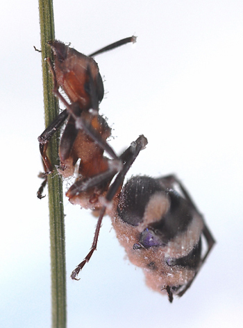 Auch möchte ich nochmals darum bitten, auf derartige, in Nestnähe an Grashalmen festgeheftete Waldameisen zu achten. Es wäre sehr interessant zun erfahren, ob der parasitische Pilz auch in Deutschland vorkommt!