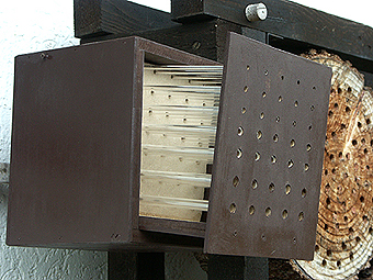Ja, dann schenkte mir ein früherer Student zum Ruhestand einen Nistkasten für Solitärbienen, ganz modern, mit Plastikröhrchen (Abb. 1, hier noch ganz neu).
