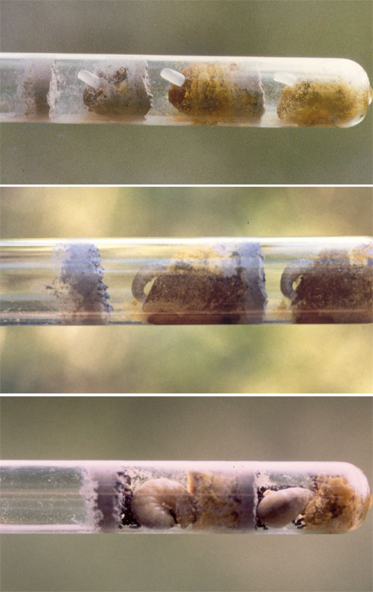 Nach einiger Suche in der Fachliteratur wurde ich fündig: In den wunderbaren Büchern von P. Westrich (1989, Die Wildbienen Baden-Württembergs, Bd. II, S. 448) steht ein kleiner Hinweis, wonach bei „vielen Megachiliden“ (Blattschneiderbienen, wozu auch die Mauerbienen gehören), die Larven bereits in früheren Stadien Kot in Form kleiner Bällchen abgeben. Sie bleiben auch nach dem Schlüpfen in den Brutröhren zurück. Abb. 3 zeigt ein Röhrchen mit dunkelbraunen Puppenkokons, unter denen der schwärzliche Larvenkot liegt.