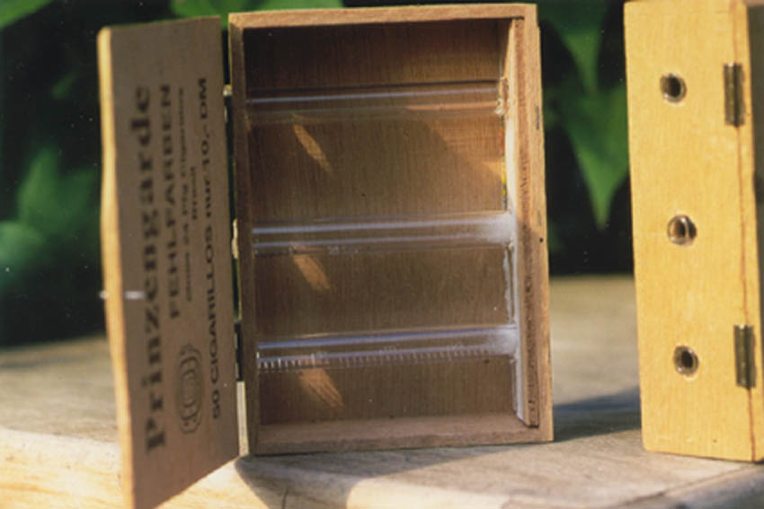 Selbst gebastelte Insektenbeobachtungskästen aus Zigarrenkisten. An der Innenseite der Rückwand ist eine zusätzliche Leiste mit entsprechenden Bohrungen eingeklebt, damit die Röhrchen nicht verrutschen.