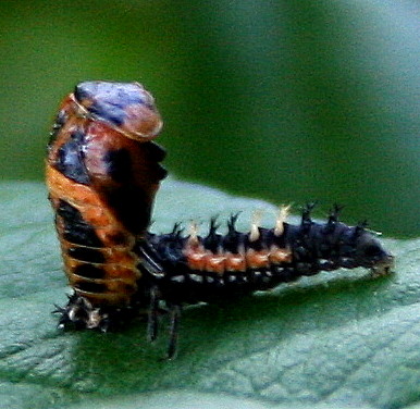 Ich werde Ihnen ein Foto der Larve; eines einer Larve während der letzten Häutung vor der Verpuppung; eine andere Larve fressende Larve des As. Marienkäfers; einen Käfer, der versucht, eine Mumienpuppe gleicher Art zu begatten.