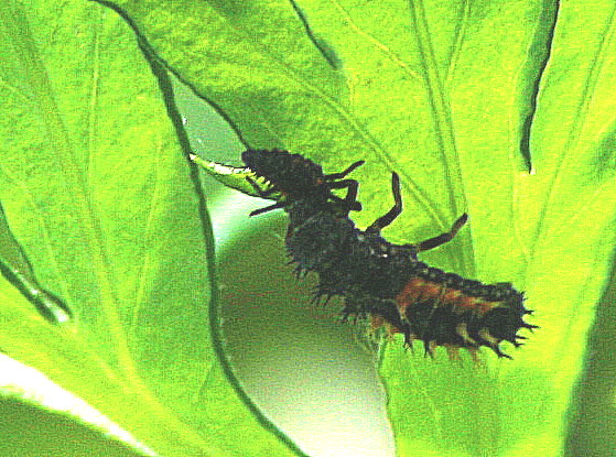 vorbehaltlich der Möglichkeit, auch selbst einmal einer Verwechslung mit dem Siebenpunkt, Coccinella septempunctata, zum Opfer gefallen zu sein, kann ich hier an der Innerste bei Hildesheim leider wohl mit Fug und Recht von einer beängstigenden Invasion des Harmonia axiridis sprechen. Nahezu an allem, was grün ist, sitzen dieses Frühjahr unzählbare Käfer, Larven und Puppen des ungebetenen Gastes! Das heißt, mit dem Ungebeten ist das wohl so eine Sache: Vor einigen Jahren, nämlich, wurde der Käfer mit staatlicher Zustimmung in Gewächshäusern zwecks natürlicher Schädlingsbekämpfung eingesetzt! Er sollte die Nutzpflanzen von ihren Blattläusen freihalten. Der Grundgedanke war gut, man wollte auf diese Weise den Einsatz chemischer Keulen vermeiden. Es kam aber, wie es kommen musste: Heute finden wir den asiatischen Marienkäfer bereits bald überall in der freien Natur, und zwar nicht nur in der friedlichen Rolle des Schädlingsbekämpfers! Nachdem er den Weg nach draußen in die Natur bewältigte, macht er nun eine Massenvermehrung durch. Die Larven fressen nicht nur Blattläuse ( bis zu 270 Stück pro Tag), sondern auch die Larven unserer einheimischen Marienkäfer und andere Nützlinge! Längerfristig könnte das bedeuten, dass einheimische Arten verdrängt werden. Wie weit es sich auswirken wird, dass sich angeblich im Herbst Schwärme dieses Eindringlings an unseren reifen Früchte laben sollen, bleibt abzuwarten. Die Weinbauern, jedenfalls, sind bereits alarmiert: Der Käfer bedient sich nicht nur des Saftes dieser Früchte! Gelangen die Marienkäfer im Zuge der Weinlese mit in den Verarbeitungsbereich, so geht deren Hämolymphe mit in die Maische oder Most über. Dies kann zu beträchtlichen Einbußen hinsichtlich der Weinqualität führen!