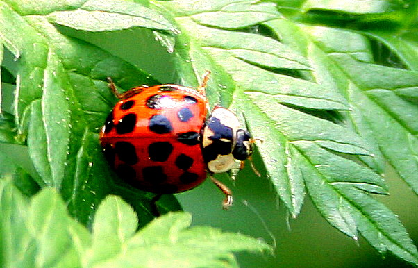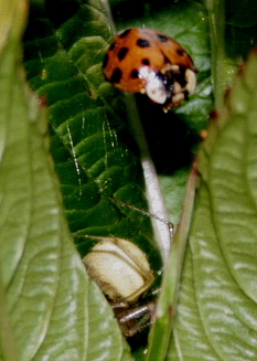 Das alles und noch viel mehr fällt schon einmal weg, wenn Harmonia axyriridis ungebeten und schädlich sein Unwesen treibt. Denn natürliche Feinde hat der Käfer bei uns nicht, wenn auch gelegentlich einmal beobachtet wird, dass eine Spinne das Glück hatte, einen Käfer im Netz zu haben. Auch sind unsere sonst so nützlichen und unverzichtbaren Waldameisen als Gesundheitspolizei nicht in der Lage, diesem ungebetenen Gast Paroli zu bieten! Sie sind für Ameisen unangreifbar.