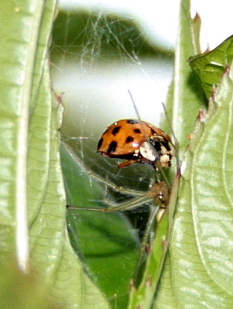 noch vorgestern sah es hier an dem Flüsschen Innerste so aus, als könnte ich jetzt von einem Schlaraffenland für Spinnen (Kugelspinne, Enoplognatha ovata) sprechen: Verschiedentlich labten sie sich an den wohl mit Recht Besorgnis erregenden Asiatischen Marienkäfern - siehe Fotos. Gestern, dagegen, fand ich keine Fortsetzung dieser "Fressorgien" mehr vor.