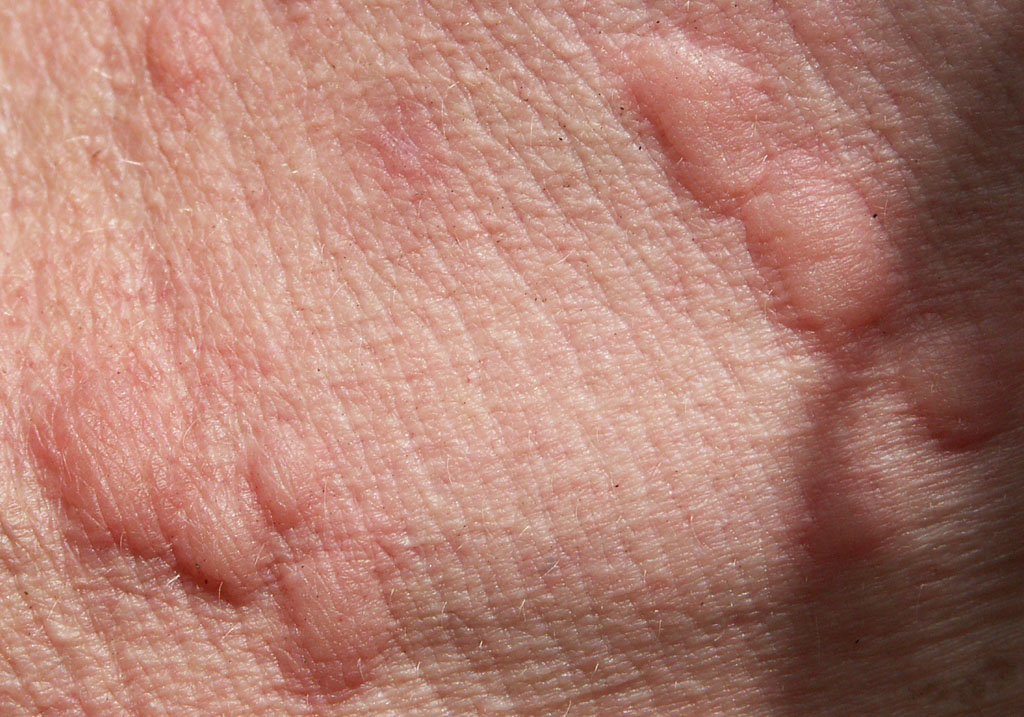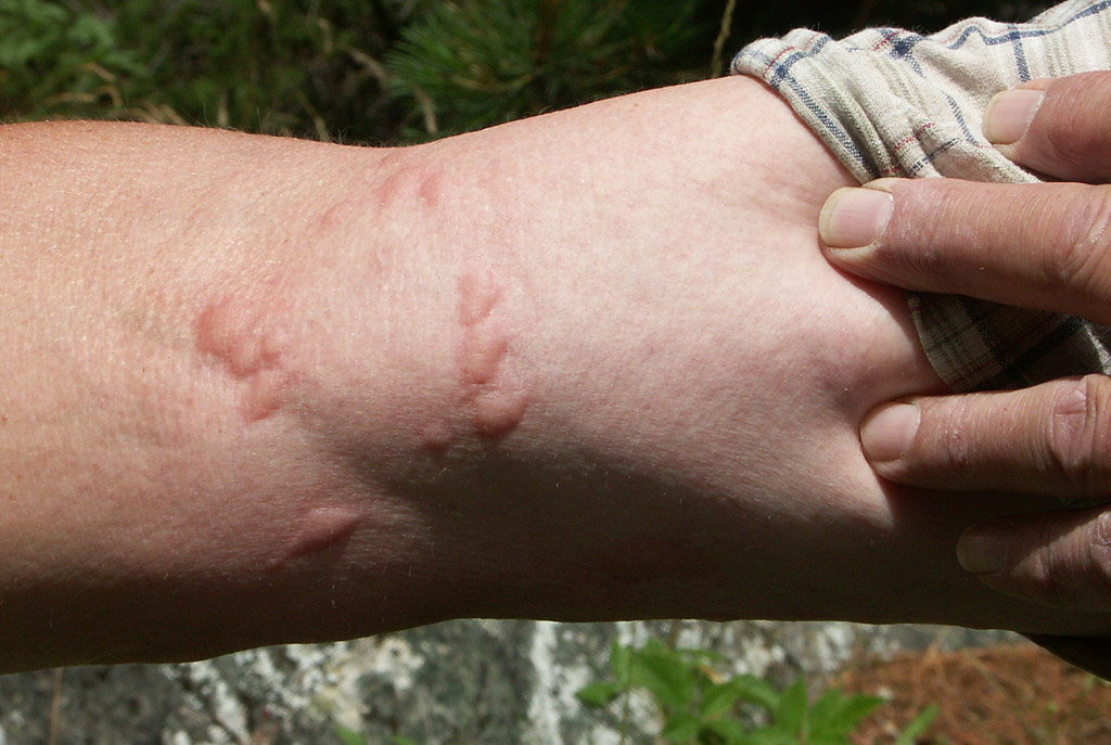 Dies ist eine ganz normale Reaktion auf die Stiche der Rasenameise (ich bin nicht allergisch). Die erheblich größeren Roten Knotenameisen (Myrmica spp.) rufen eine ähnliche, etwas stärkere Hautreaktion hervor. Insbesondere können sie die menschliche Haut nicht nur an besonders weichen Stellen (Armbeuge, Innenseite des Handgelenks, zwischen Fingern oder Zehen) durchdringen, sondern auch in normalen Bereichen.