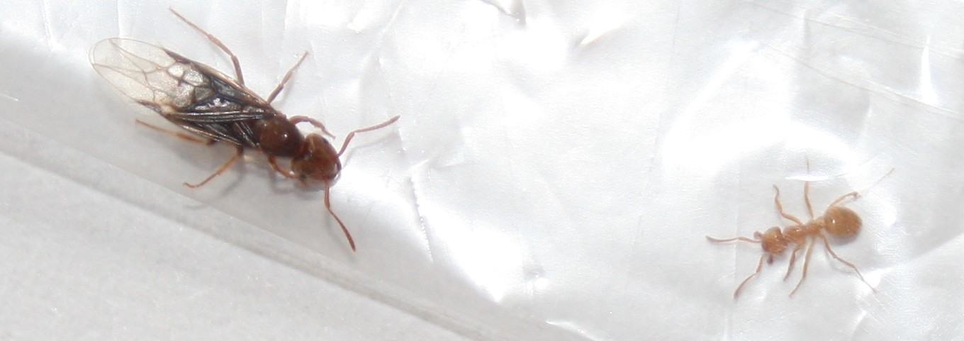 Helle Ameisen, bernsteinfarben, gleichmäßig gefärbt. Größe ca. 0,4 cm (reine Körperlänge). Jene mit Flügel sind doppelt so groß, ca. 0,8 cm.