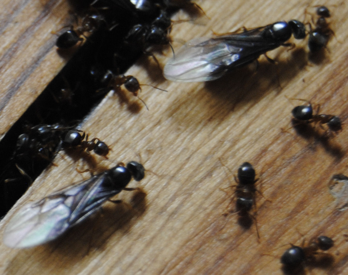 vielen Dank für Ihre Antwort. Die Fotos sind in der Tat zu dunkel geraten, aber seit gestern gestaltet es sich (zum Glück) schwierig die Ameisen erneut zu fotografieren. Der Schwarmflug scheint vorrüber und es ist plötzlich deutlich ruhiger geworden, geflügelte Tiere sind keine mehr zu entdecken und auch die Arbeiterinnen bekommt man kaum mehr zu Gesicht.