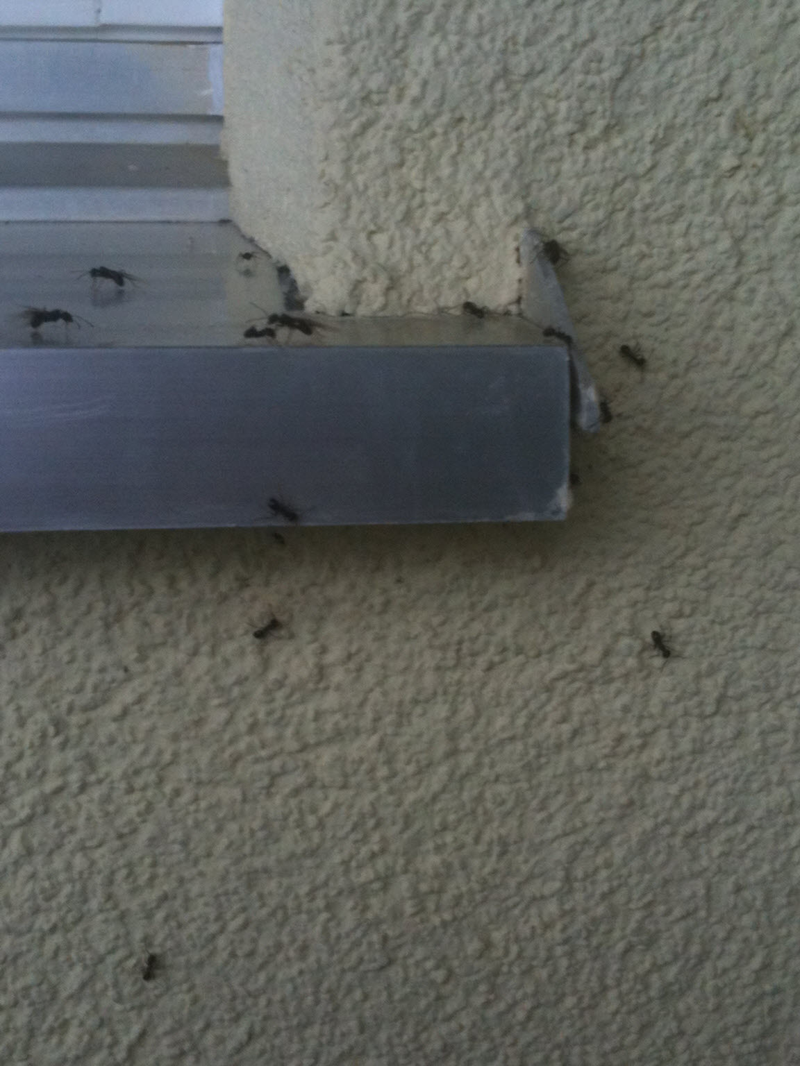 Dieses Jahr sind sie nun aber wieder am gleichen Ort in viel grösseren Mengen aufgetreten, ausserdem zwischen einer Stützmauer und der Hausmauer in Spalten verschwunden und bis zum oberen Stock unterhalb vom Balkon gerade bei einem Stützbalken in einem Spalt aufgetreten. Wir haben Ende Woche auch sehr viele geflügelte Tiere an der ganzen Wand beobachtet.