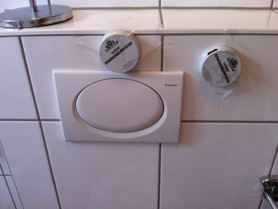Seit ca. einem Monat sind mir immer Mal wieder vereinzelt Ameisen im Bad aufgefallen, welche ich beseitigt habe und dann war gut. Doch vor ziemlich genau einer Woche habe ich dann bemerkt dass ca8 Stück aus meinem Spüldeckel der Toilette gekommen sind. Da ich ein ziemlicher Insektenschisser bin habe ich direkt Köderdosen gekauft und direkt über dem "Spüldeckel" aufgehangen. Diese Dosen haben Anfang April schon mal geholfen als wir im Erdgeschoss ( ich wohne im Keller) zahlreiche Ameisen hatten, die aber durch die Dosen innerhalb von 2 Tagen beseitigt waren.