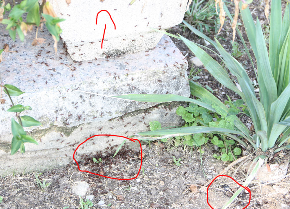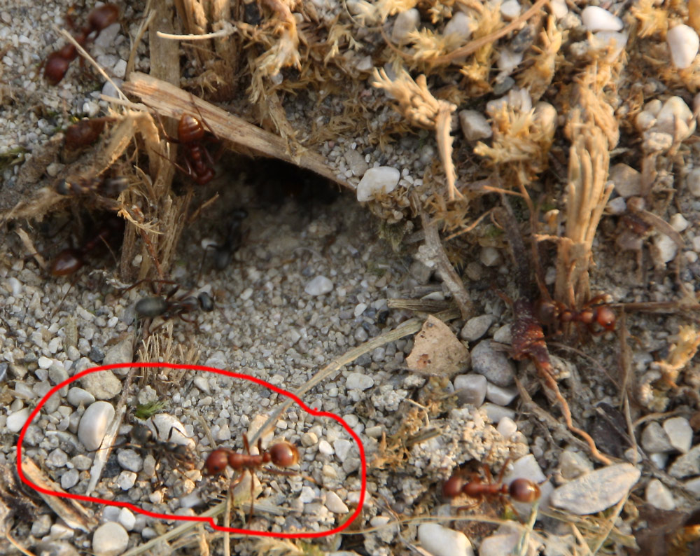 ich habe eine kurze Frage. Bei meinem Vater in Italien habe ich folgende Ameisen aufgenommen. Interessant dabei war, dass kurz bevor ich die Aufnahmen gemacht habe, eine riesen große Ameisenstraße von den roten etwas größeren Ameisen zu diesem Nest führte. Nach dem mir dann aufgefallen ist, dass ebenfalls die kleineren schwarzen Ameisen am Nest waren und nicht angegriffen wurden, dachte ich an eine Art die Sklaven hält. Ich habe mal ein wenig im Internet geschaut, doch keine vergleichbaren gefunden. Auf dem Foto (leider aufgrund schlechter Lichtverhältnisse nicht ganz schwarf) sieht man im rot markierten Bereich beide Ameisen Arten.