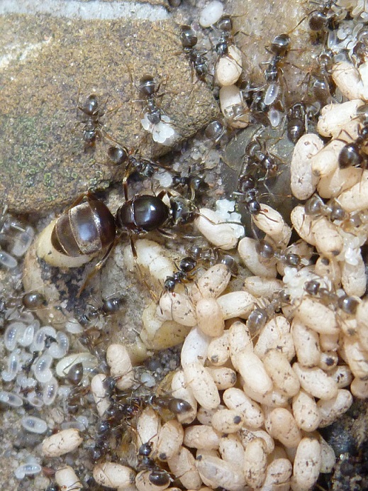 Habe gerade auf meiner Terrasse diese Ameisenkolonie gefunden und mich sehr über die Größe der Arbeiterinnen gewundert. Diese sind im Millimeterbereich.