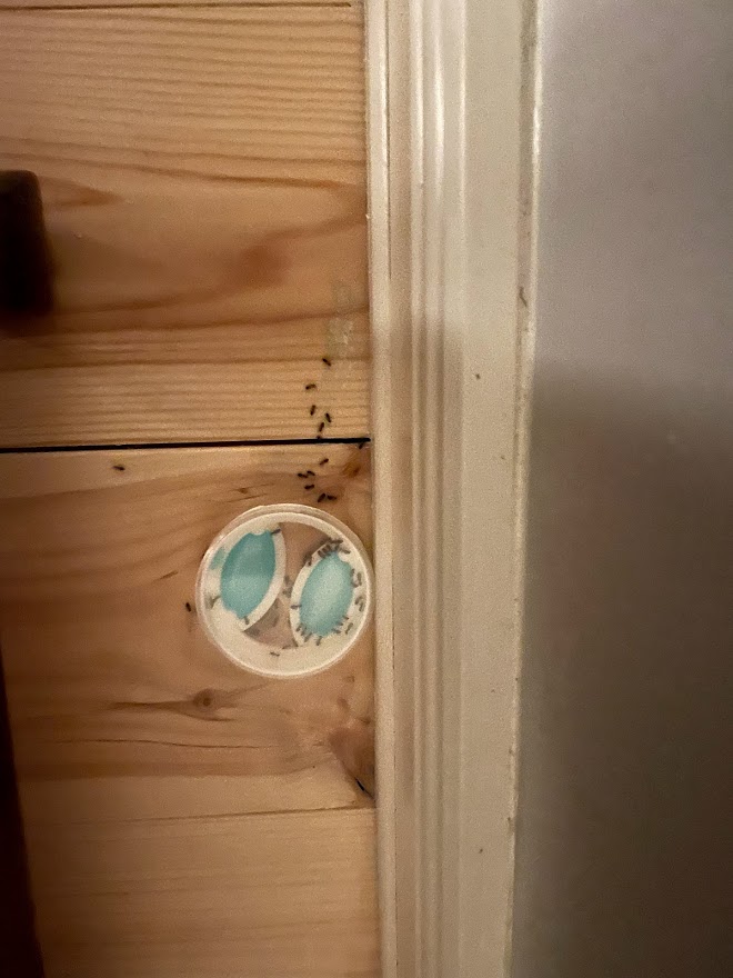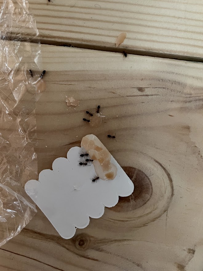 Wir haben jetzt große Sorge, dass uns wieder der Schwarmflug erwartet und haben jetzt versucht, mit verschiedenen Fraßködern gegen die Ameisen vorzugehen. Die Ameisen haben diese aus unserer Sicht auch ganz gut (oder für sie schlecht) angemommen, es herrschte nach Auslage recht schnell einigermaßen reger Verkehr (s. Fotos). Dabei haben wir es zunächst mit Neudorff Ameisen Buffet und anschließend mit Ameisengel (Imidacloprid) probiert, letzteres hat erst in Kombination mit Hähnchenfleisch gut funktioniert. Auf uns hat es so gewirkt, als ob die Ameisen die Köder auch wegtransportieren, jedenfalls gab es großen Andrang und viel Bewegung. Nach der ersten "Behandlung" mit Neudorff waren die Ameisen tatsächlich auch mehrere Tage wie vom Erdboden verschwunden, nachdem sie wiedergekehrt sind, haben sie keine Lust mehr auf das Zeug gehabt, sodass wir auf das Ameisengel mit Hähnchen umgestiegen sind (es ist wirklich verrückt, was man dann alles probiert).