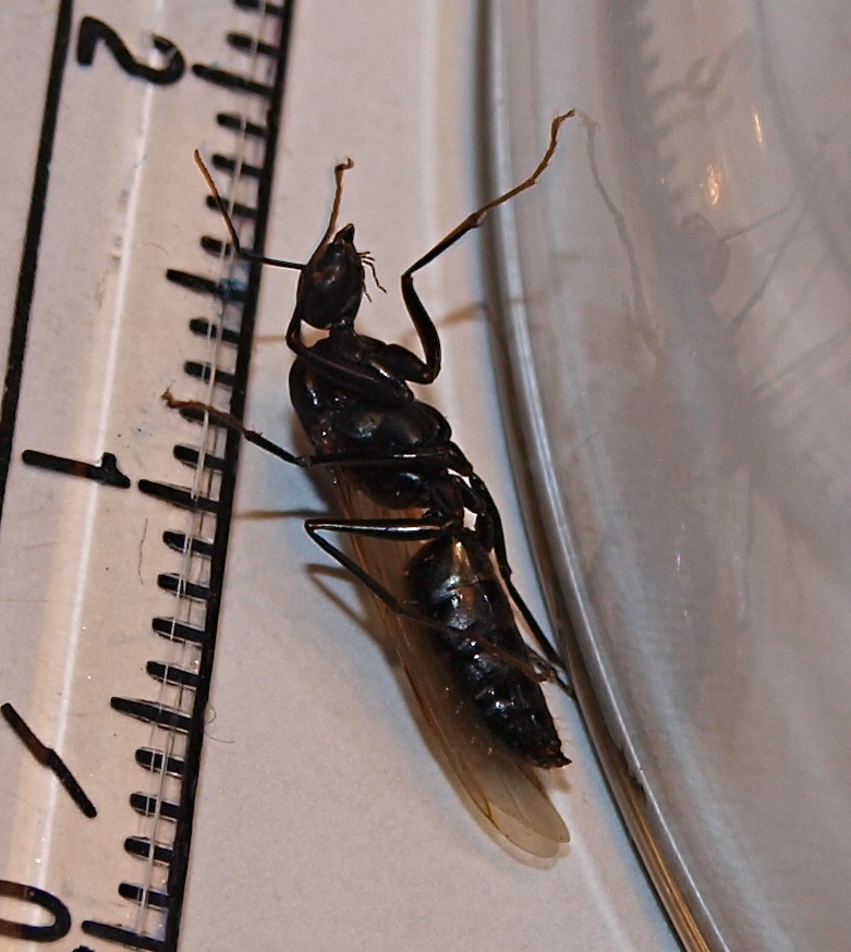Nun zum eigentlichen Problem. Seit etwa zwei Wochen tauchen im Flur und den Zimmern des 1 Stockwerkes vermehrt Ameisen auf. Die Tiere sind schwarz, mind. 1 cm lang und geflügelt - siehe Fotos. Sie treten den ganzen Tag über, vermehrt aber in den Abendstunden auf. Dann scheinen sie zum Licht hin zu streben. Zurzeit finden sich über den Tag verteilt ca. 20 bis 30 Tiere. Sie laufen nicht sehr zielstrebig und vor allem am Boden umher. Woher die Ameisten kommen, ist nicht auszumachen. Auffällig ist nur, dass sie weder im Erdgeschoss noch im obersten Stockwerk sind (einem teilweise ausgebaute Dachstuhl), sondern nur im 1. Stock. Probleme mit Feuchtigkeit bestehen nicht bzw. sind uns bislang nicht aufgefallen. Allerdings befindet sich das Bad im 1. Stock, ist also umgeben von Holzwänden.