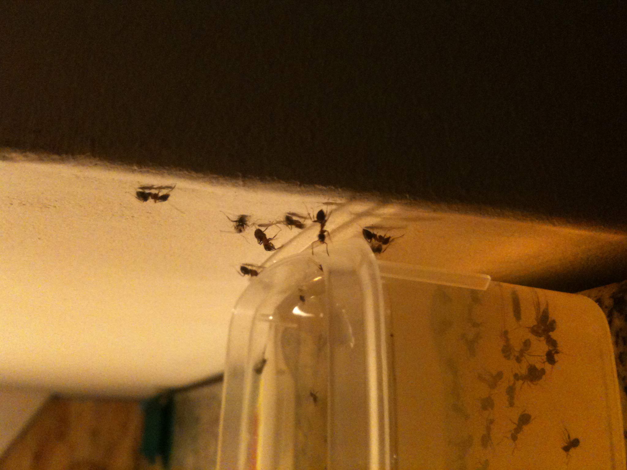 Die Ameisen haben eine Laufstrecke von der Einbauküche am Balken entlang nach oben. Dort oben verschwinden sie, obwohl da theoretisch kein Platz für sie ist. Zwischen Wand und Küchenschränken verschwinden sie auch.