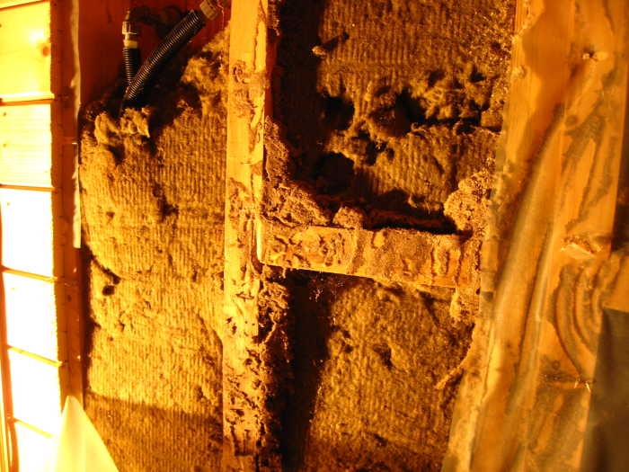 Wir haben nun vor 2 Wochen die Wand geöffnet, in der wir die Ameisen vermuten. Es handelt sich um die Wand, an deren anderer Seite die Dusche des Bads eingebaut ist. Eindeutig ist durch die Rückseite der Dusche, wo die Fugen der Kacheln nicht mehr dicht waren, viel Feuchtigkeit in die Wand gelangt und hat dort den unteren Teil eines Pfostens faulen lassen, ebenso die darunter liegende Schwelle.