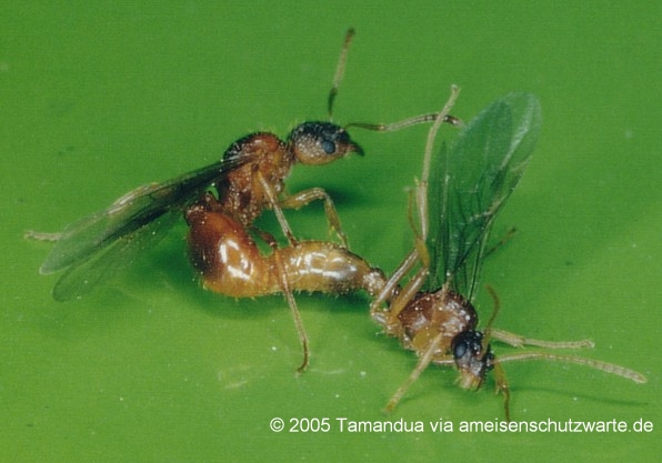 Auch ich war einmal in ein großes Massenschwärmen von Myrmica ruginodis geraten, ein eindrucksvolles Erlebnis! Eine enorme Anzahl von Geschlechtstieren flog in dichter Wolke, die sich von unmittelbarer Bodennähe bis mehrere Meter darüber erstreckte und ließ sich teilweise auf der Vegetation, einem Wirtschaftsweg und auf einem am Wegesrand geparkten, giftgrün lackierten PKW nieder (daher die Hintergrundfarbe der Abb. 1), mehrere ♂♂ dabei einzelne ♀♀ verfolgend, allenthalben waren Kopulationen zu beobachten.