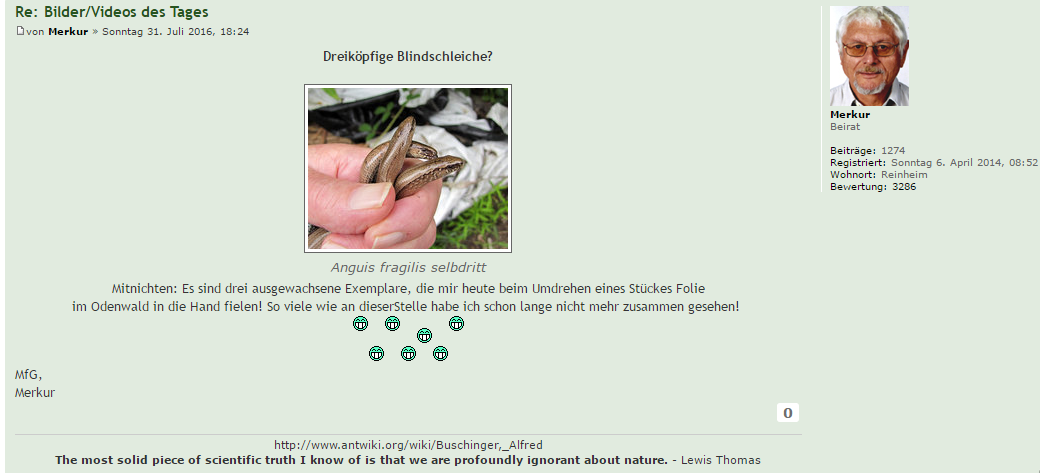 Betr. Ihrer ewig wiederholten Vorwürfe wegen meines Bildes mit den drei Blindschleichen sollten Sie sich mal informieren, was ich im Ameisenportal dazu geschrieben hatte: