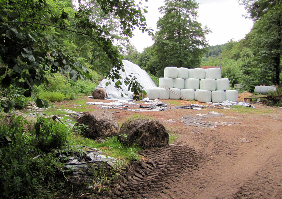 Zu dem Gehöft gehört ein weiter Platz, auf dem Heu in Form der inzwischen verbreiteten Plastikklumpen gelagert wird, zum Teil unter noch größeren Planen zeltartig gestapelt. Und allenthalben liegen gebrauchte Planen als Müll herum, auf dem Platz, am Waldrand, im Bachbett. Das sind für manche Tiere, Ameisen, aber eben auch die Blindschleichen, „willkommene“ Verstecke. Darunter ist es immer feucht, eine Seite der Planen ist weiß, die andere schwarz, so dass unterschiedlich warme Bereiche dicht nebeneinander liegen, einfach ideal!