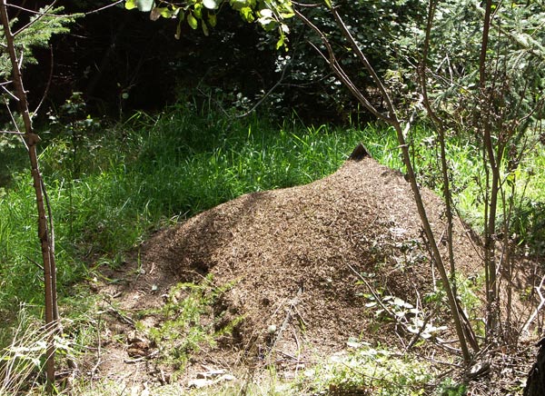 Bild 3: Ein Nest von Formica rufa. Das Nest war mit einer Schutzhaube versehen, die allerdings bis auf eine kleine Spitze zugebaut war. Das Netz bestand nicht aus Draht, sondern aus einem Kunststoffgeflecht. Vielleicht wird es von den Ameisen eher wie nat