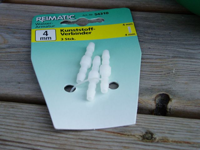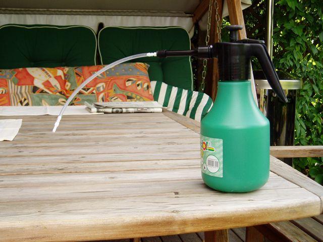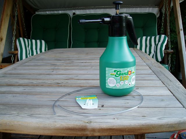 Nicht ganz einfach war, die Lösung in der korrekten Tiefe einzubringen (zwischen dem alten Styropor und Mauerwerk in ca. 24 cm Tiefe). Hierzu habe ich mir zunächst eine kleine Pflanzenspritze gekauft. Als ich aber feststellte, dass die einen kegelförmigen Sprühnebel erzeugt statt geradeaus zu spritzen, habe ich in der Gartenabteilung vom Baumarkt noch einen dünnen Schlauch (4 mm) mit Steckadaptern besorgt, die ursprüngliche Düse mit Bohrern auf 4 mm aufgeweitet und alles zusammen gesteckt und geschraubt. Bilder s. unten.